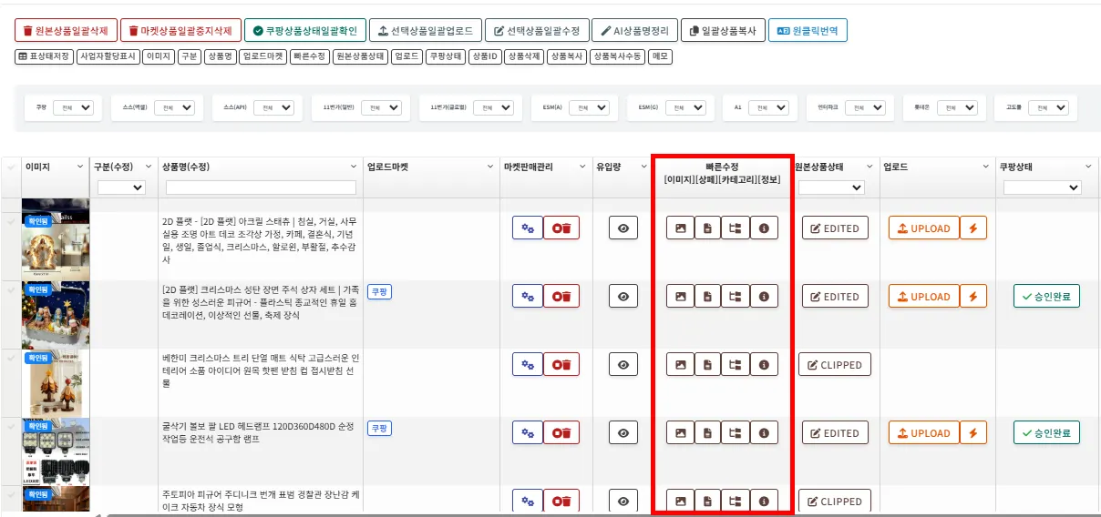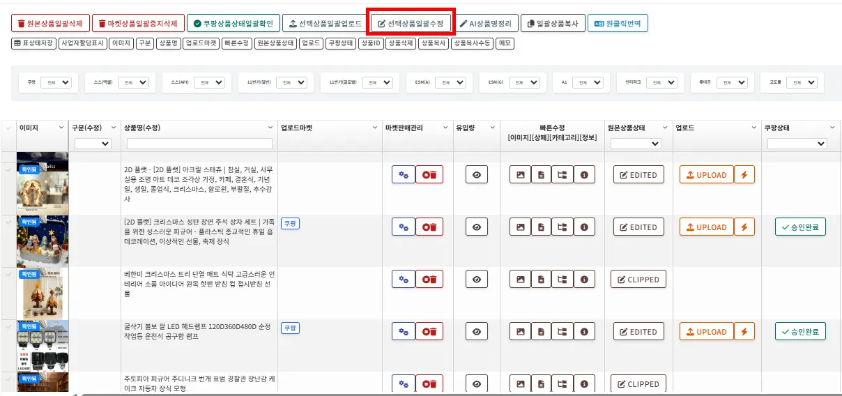 각 마켓에 업로드하게 되면 업로드마켓 부분에 쿠팡, 스스, 11번가 등 업로드 된 마켓의 표기가 생성됩니다. 해당 버튼을 클릭하시게 되면 상품으로 바로 이동이 가능합니다.