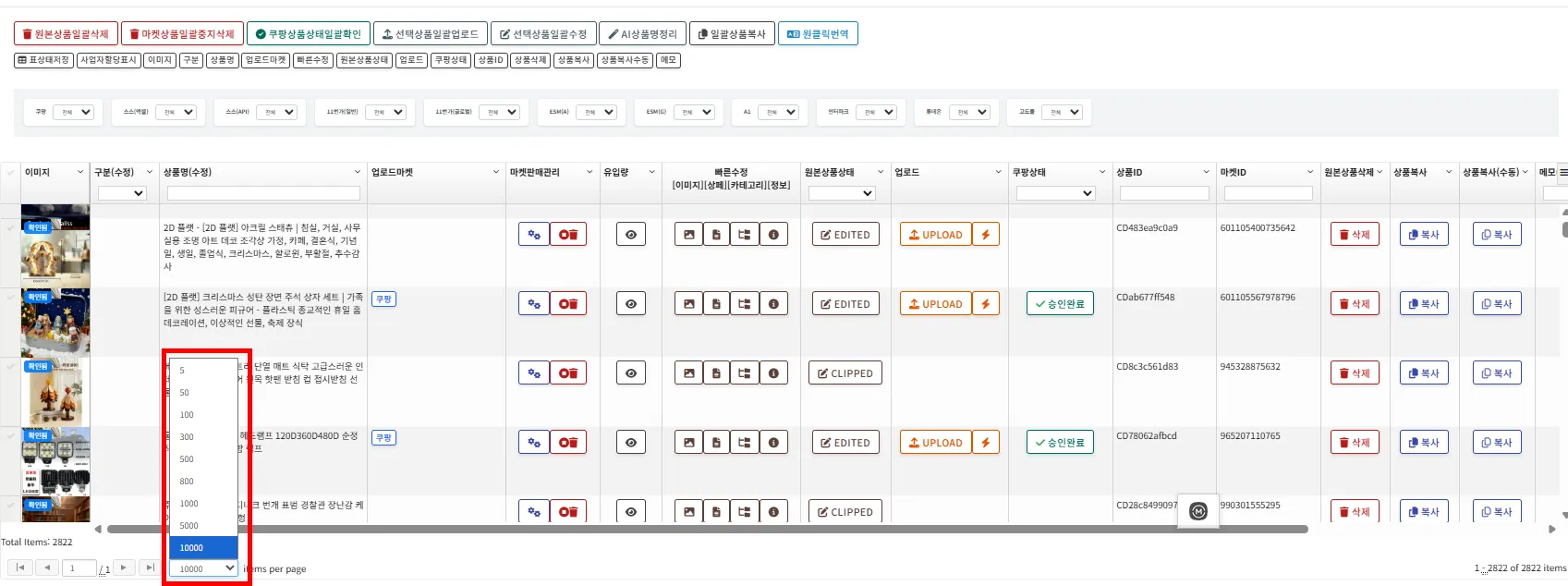 리스트 하단에서 페이지 당 상품수를 최대 10,000개까지 확인 가능