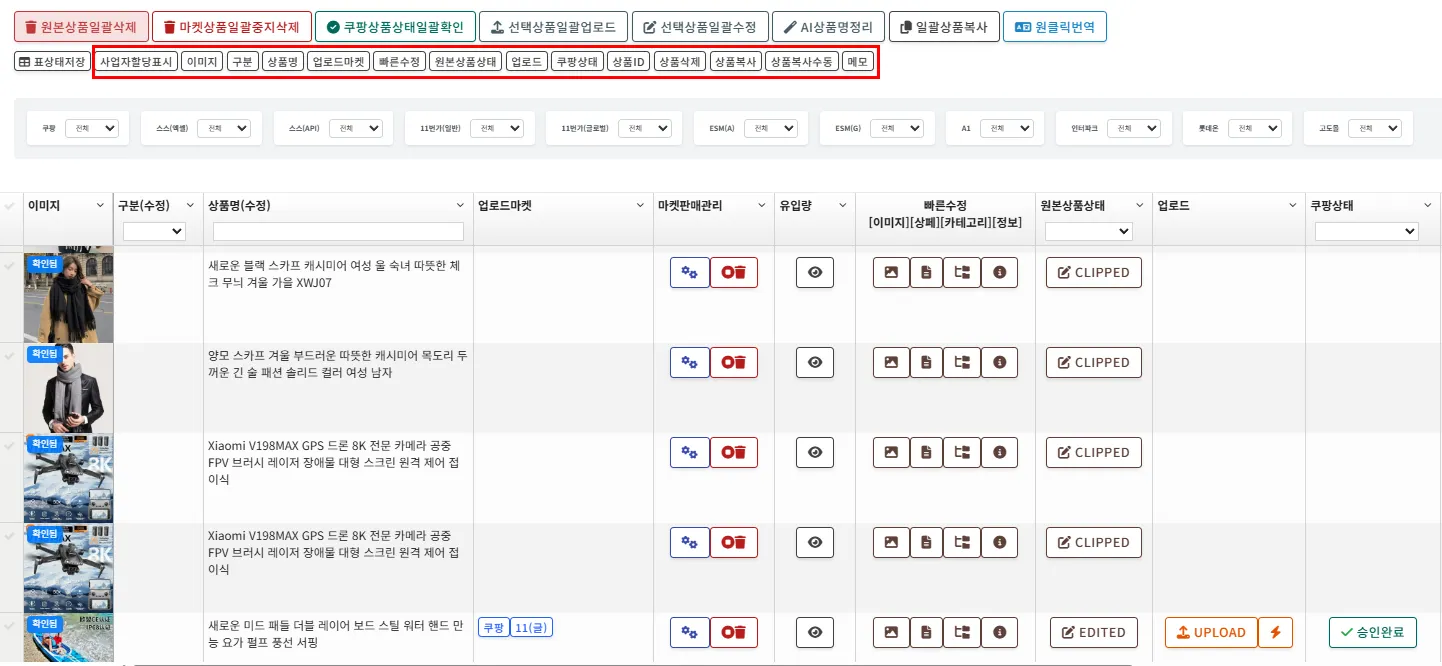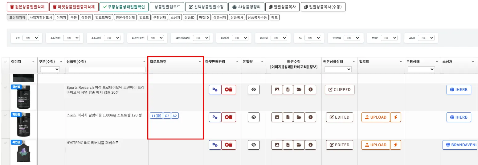 각 마켓에 업로드하게 되면 업로드마켓 부분에 쿠팡, 스스, 11번가 등 업로드 된 마켓의 표기가 생성됩니다. 해당 버튼을 클릭하시게 되면 상품으로 바로 이동이 가능합니다.