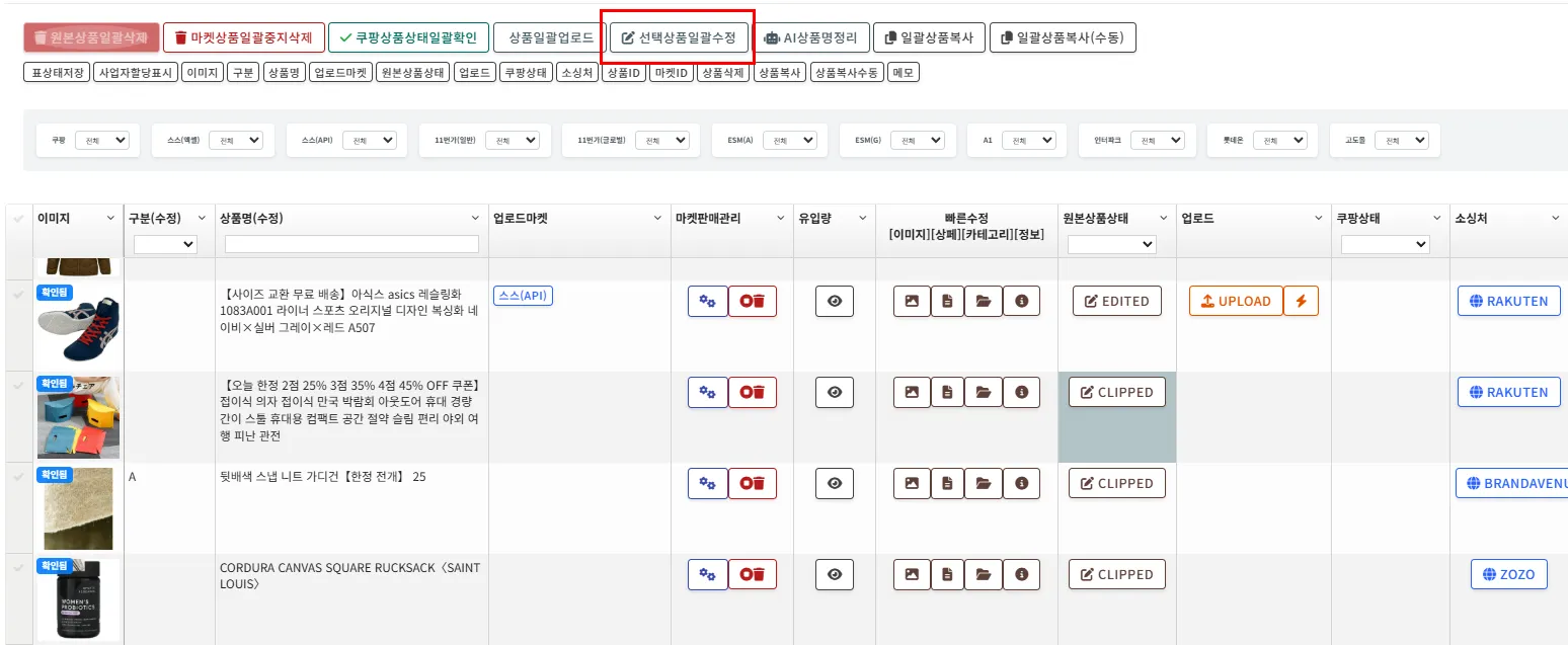 선택상품 일괄수정 버튼을 클릭합니다.