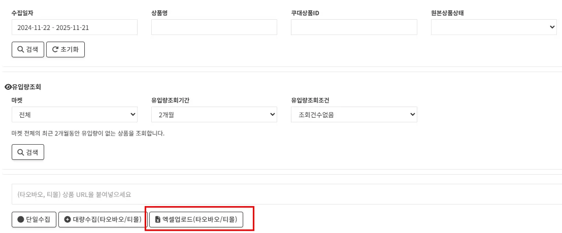구매대행 > 중국(상품)에서 엑셀업로드(타오바오/티몰)을 클릭합니다.