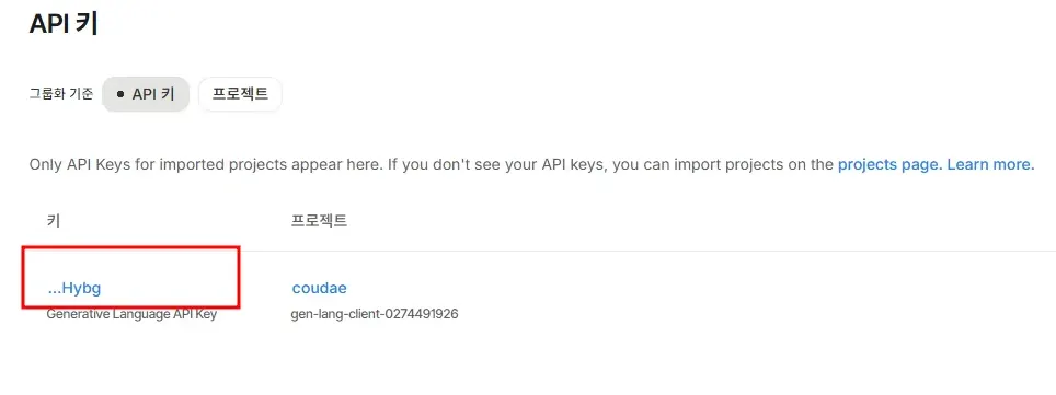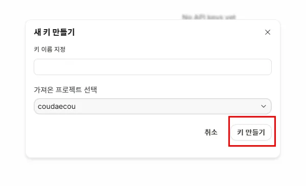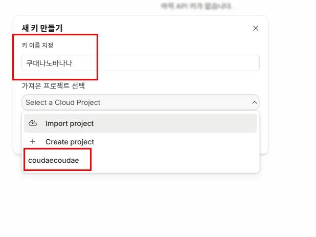 새 키 만들기에서 키 이름을 지정하고, 가져온 프로젝트에서 설정한 coudaecoudae를 클릭합니다.