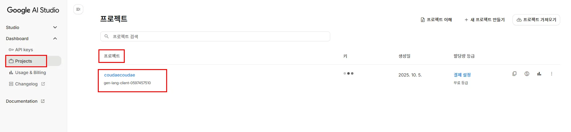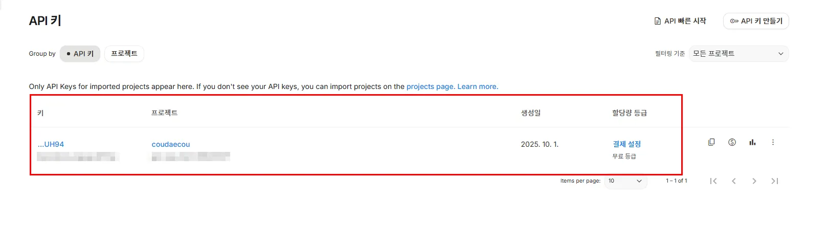 API키, 프로젝트, 생성일, 할당량 등급이 확인됩니다