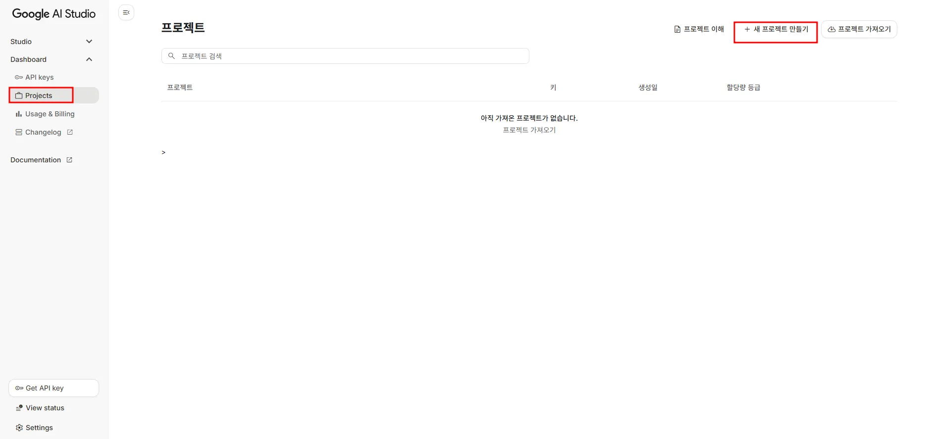 좌측탭에서 Projects 탭 클릭후, 새 프로젝트 만들기를 클릭합니다