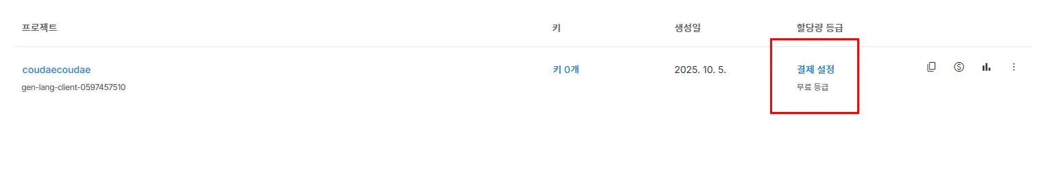 프로젝트 우측에 결제 설정을 클릭합니다.