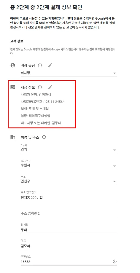 2단계 중 2단계 결제 정보를 추가로 입력합니다.