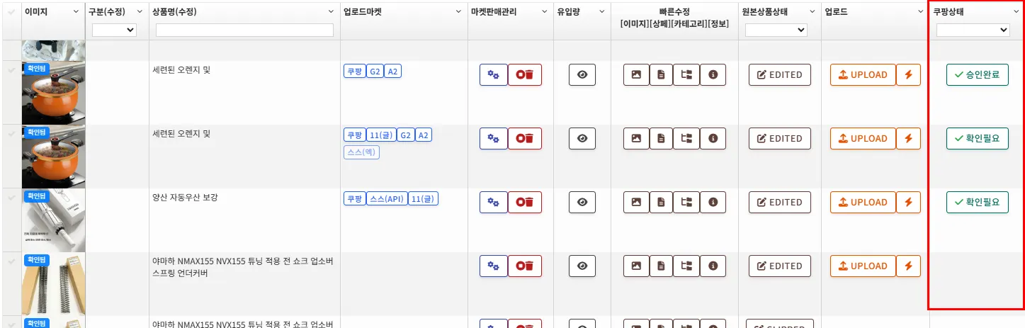 확인필요 : 쿠팡에 상품이 올라가고 있는 중으로 확인필요를 눌러야 승인완료가 됨