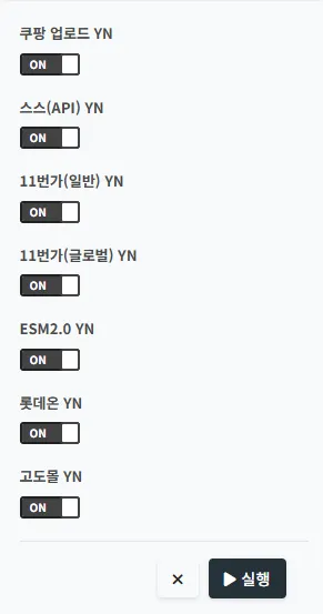 쿠대 설정에서 각 마켓 별로 클릭 후 업로드YN 메뉴에서 Y 또는 N으로 선택을 합니다.