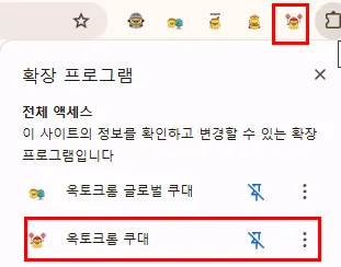 브라우저 우측 상단 확장프로그램 클릭 후 아이콘 클릭하여 옥토크롬 고정